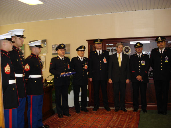 The U.S. Embassy in Brussels hosts les motards du 11 september. Chargé d'Affaires Will Imbrie met with them and three U. S. Marines folded the American Flag that they will take with them on their trip to the United States. |