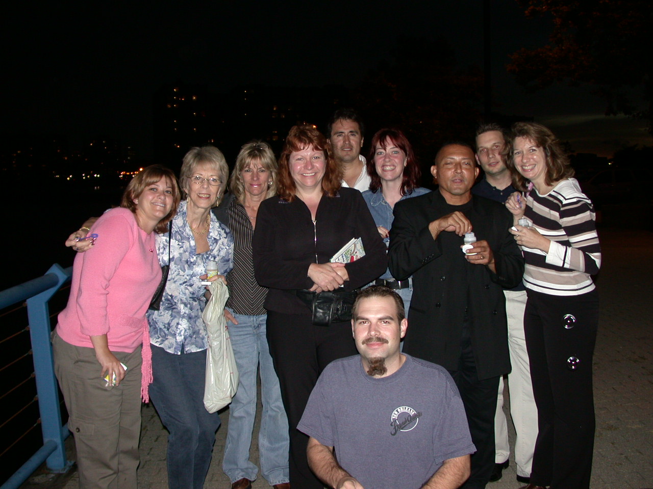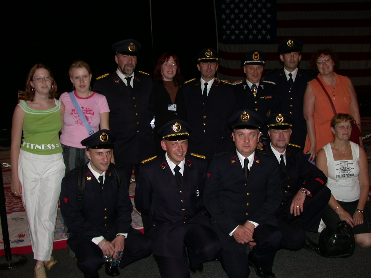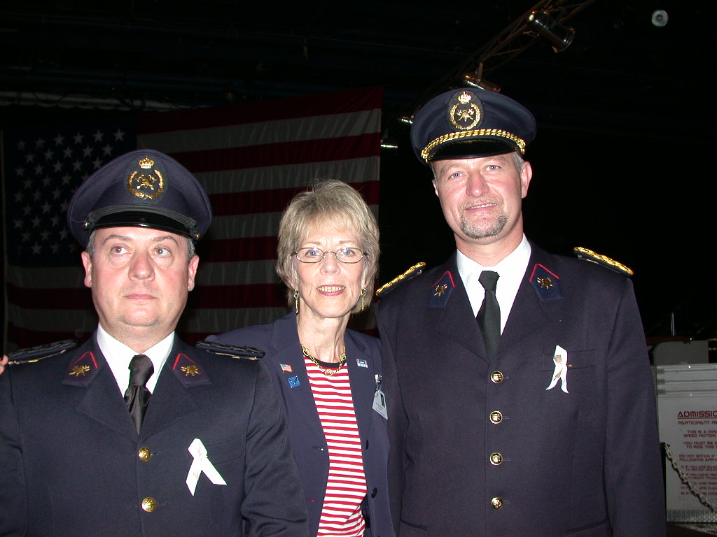 So imagine, here I am at an event on 9/11 in New York City. The day before the event, I see a fireman looking at the quilt. I walk over and begin to tell him about the quilt. Then he motions for other firemen to come. They all stand and smile. Then when I am done telling them, I invite them back for the service on the following day. Their reply? "No Speak English" I'm sure many people that have worked with me over the past 3 years years thought to themselves how fortunate these firemen are. But we were able to communicate with the help of an English speaking wife and the Director of Protocol at the Intrepid. We also found out that our Firemen where from Belgium and have motorcycled in memory for those lost on 9/11. Their site is http://www.motardsdu11septembre.be.tf. Tell them I sent you and remember they speak French! | Daniel Lemaster stole the stage with his accapella version of " Oh Danny Boy". As a performer to be able to sing with no accompaniment is impressive enough, and then to do it again upon my request for the Belgium firemen was even more. His voice is that of an trained professional, his heart that of yet another of the quilts angles. Daniel added his own words for a special tribute to our soldiers. We are all proud to have him as a part of the quilt. |