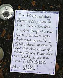 Timothy R. O'Donnell (O'Donnell & Lee, LLC) For all you help and support in becoming Incorporated! Dale Coots from Annin (for sharing great wisdom about the flag code!) Our two favorite Mardens Managers Doug Harlow And Jim Evans from the Morning Sentinel (you guys got the ball rolling) Susan Belaus from Fabric Traditions for helping to create this quilt and an ever helping hand Will and Yasutomo (Enough fabric markers to send to every state) Kassey Corbin (one of the kindest young persons we know) George Manlove from the Kennebec Business Monthly Jessica Laliberte , Don Cookson and the channel 5 crew (so uplifting and kind) Brian Blake from The George Bush Presidential Library and Museum (so grateful for help with addressing former Presidents!) Hathaway Shirt Company (some of the greatest people you'll ever meet) Catholic Charities of Maine (such a great help and support) National Catholic Education Association Are you ready to party (decorations to inspire) West Point Military Academy Class of 77 Industrial Fabrics Association International Mike Gormally From VFW (helping to get the word out and the kindest words!) Thank you to all for your kind words of encouragement. And to all of you helping to spread the word, thanks. Will, a new friend from CA, Says that this is a good thing for our country. kinda gives you chills hu? ![]() Oslo, Norway Outside the American Embassy |